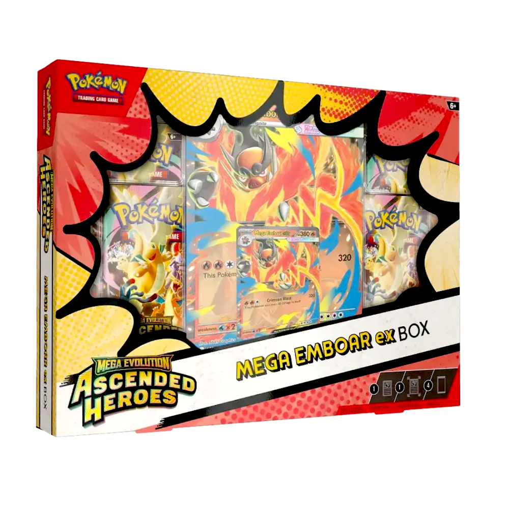 Το Mega Emboar ex Box από την επέκταση Mega Evolution – Ascended Heroes του Pokémon Trading Card Game παρουσιάζει τον ισχυρό Emboar σε Mega Evolution μορφή. Το σετ περιλαμβάνει foil promo κάρτα Mega Emboar ex και μία oversized lenticular κάρτα με δυναμικό σχεδιασμό.