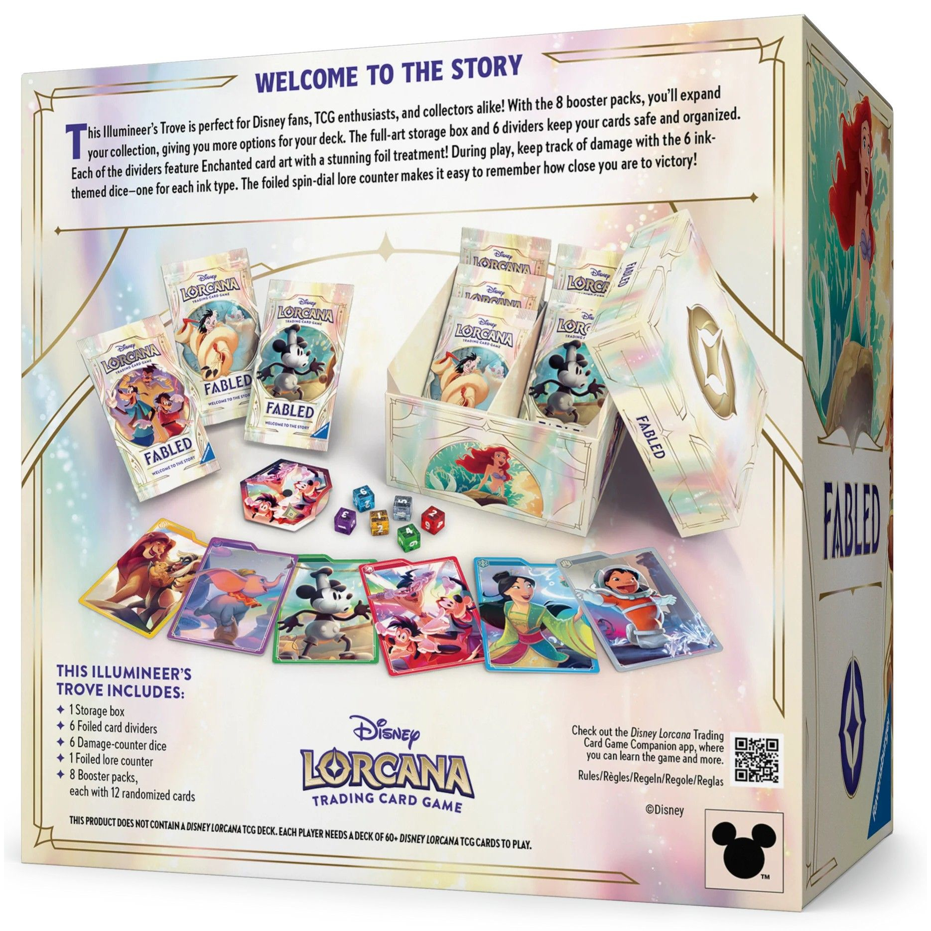 Το Trove περιλαμβάνει 8 booster packs, ειδικό storage box υψηλής αντοχής για την οργάνωση των καρτών σου, dividers, ζάρια/markers και αποκλειστικό guidebook με lore, artworks και πρακτικές πληροφορίες για το set. Είναι ιδανικό για παίκτες που θέλουν να αναβαθμίσουν το παιχνίδι τους αλλά και για συλλέκτες που αναζητούν ένα όμορφα σχεδιασμένο premium προϊόν με επίσημη Disney αισθητική.
