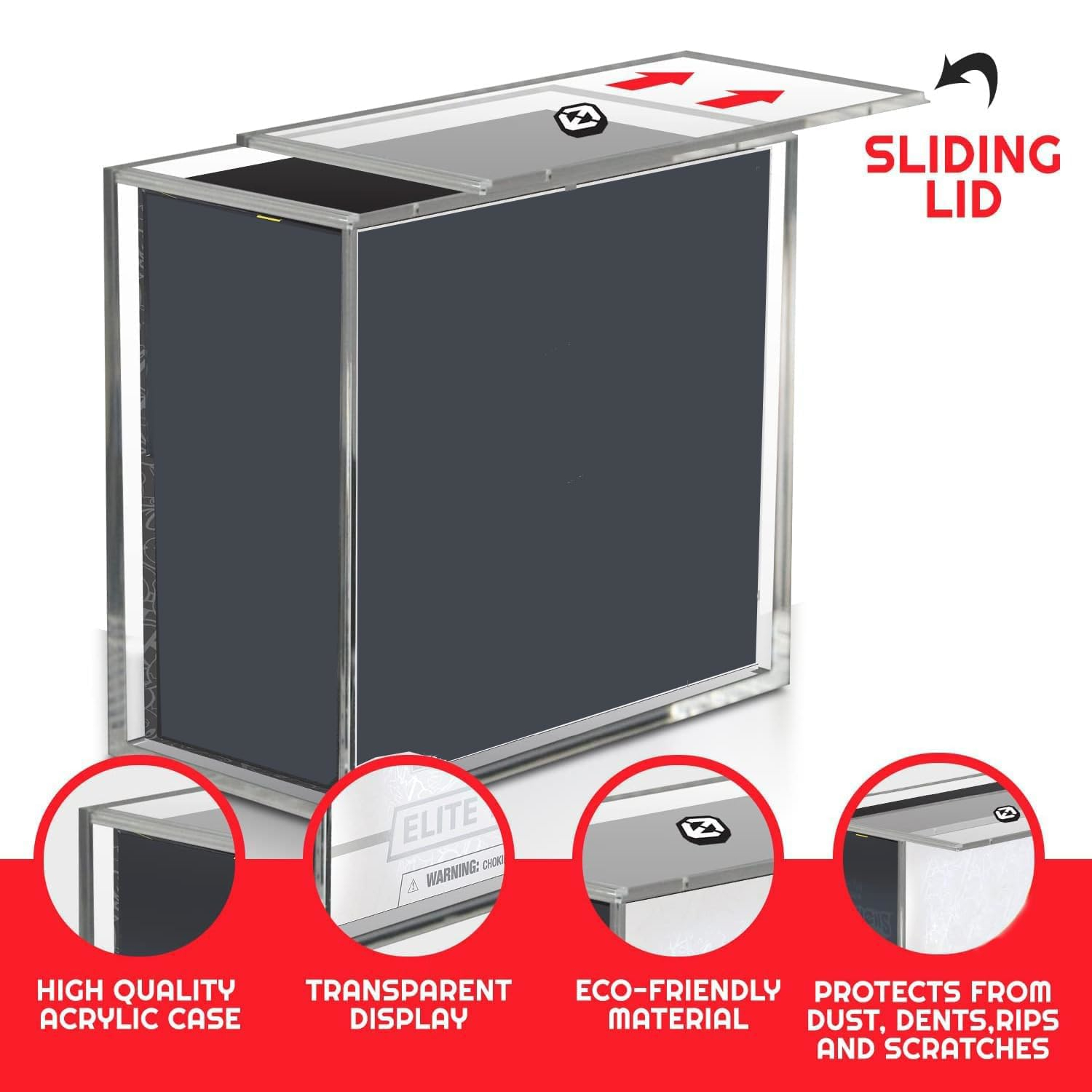 Το ακρυλικό προσφέρει εξαιρετική διαύγεια, αντοχή και κομψή εμφάνιση, παρόμοια με το γυαλί, αλλά με πολύ μικρότερο βάρος και πολύ μεγαλύτερη ανθεκτικότητα σε χτυπήματα. Η UV επίστρωση προστατεύει από το ξεθώριασμα, ενώ το συρόμενο καπάκι εξασφαλίζει εύκολη πρόσβαση και ασφαλές κλείσιμο. Πρόκειται για την ιδανική επιλογή για όσους θέλουν να αναδείξουν τη συλλογή τους με επαγγελματικό και πολυτελές αποτέλεσμα.