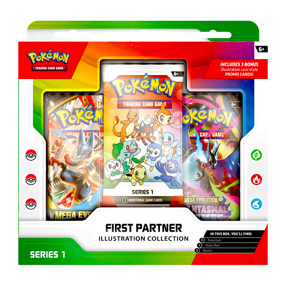 Το First Partner Illustration Collection – Series 1 από το Pokémon Trading Card Game γιορτάζει τη μοναδική σχέση μεταξύ Trainer και των πρώτων τους Pokémon. Το σετ περιλαμβάνει ειδικό pack με 3 από 9 συλλεκτικές promo κάρτες σε illustration rare style, εμπνευσμένες από αγαπημένα first partner Pokémon από τις περιοχές Kanto, Sinnoh και Alola.