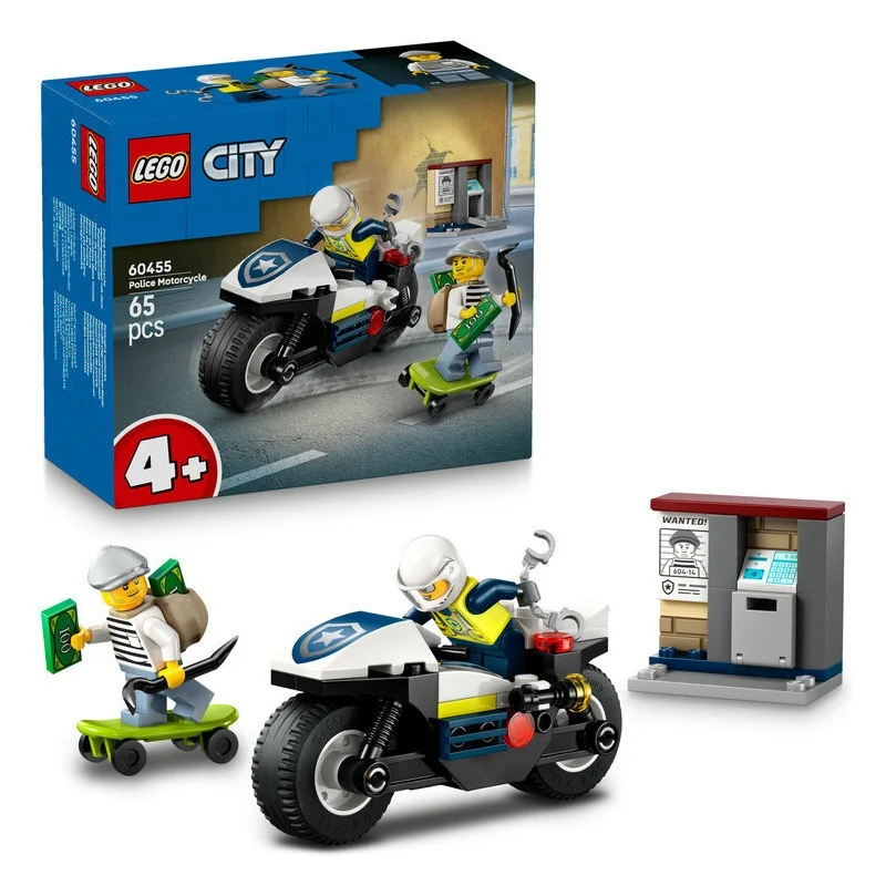 Το LEGO City – Police Motorcycle Chase (60455) προσφέρει γρήγορη δράση και ατελείωτο παιχνίδι ρόλων, καθώς οι μικροί αστυνομικοί καταδιώκουν έναν ληστή πάνω σε ένα γρήγορο skateboard! Το σετ περιλαμβάνει μία αστυνομική μηχανή, ένα όχημα διαφυγής του κακοποιού και δύο μίνι φιγούρες – έναν αστυνομικό και έναν ληστή με μια τσάντα γεμάτη «κλεμμένα» χρήματα.